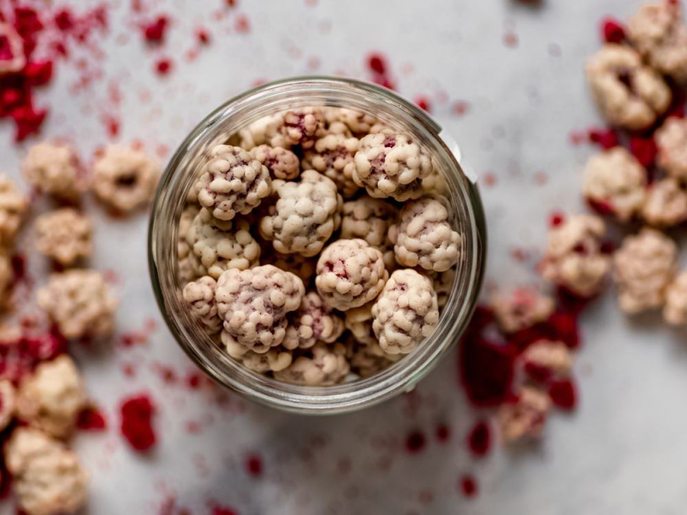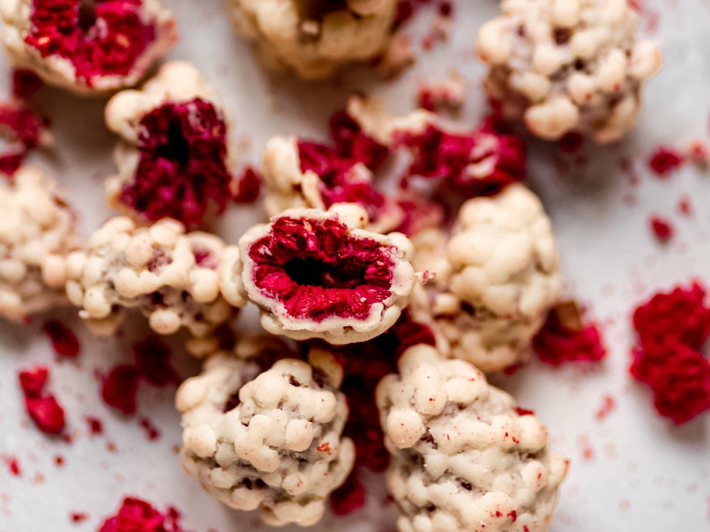 Maliny v bielej čokoláde predstavujú jedinečnú harmóniu chutí, ktorá prebudí vaše zmysly a potešia každého milovníka ovocných chutí. Maliny prešli šetrným procesom lyofilizácie a sú pripravené tak, aby si zachovali svoju prirodzenú chuť a chrumkavosť.