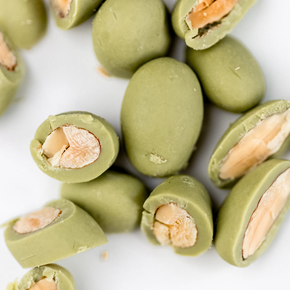 Zloženie: mandle, biela čokoláda (kakaové maslo, cukor, sušené mlieko, emulgátor: sójový lecitín, vanilkový extrakt), matcha.